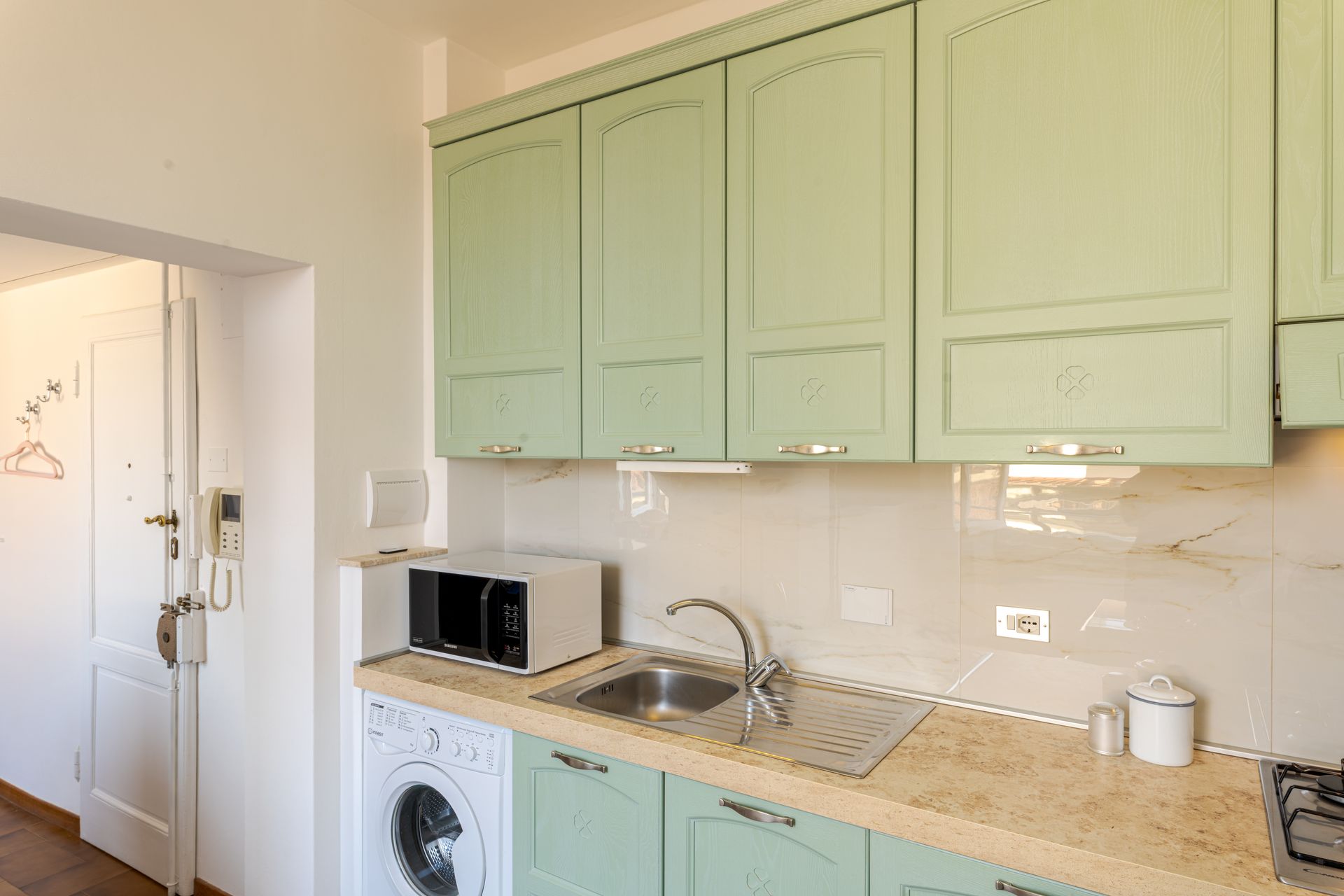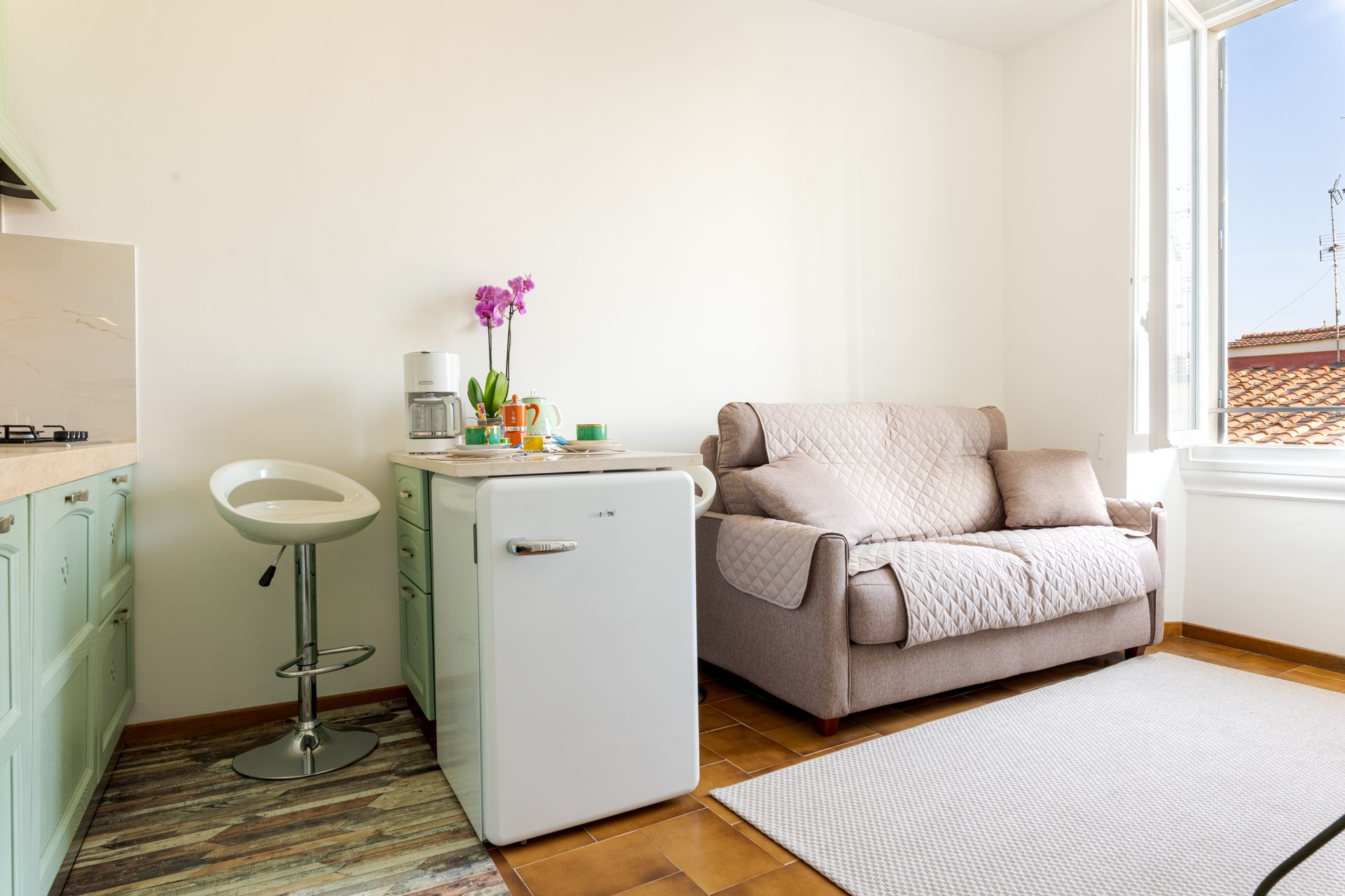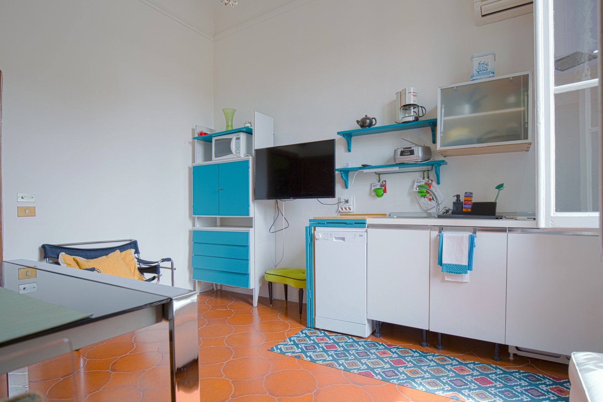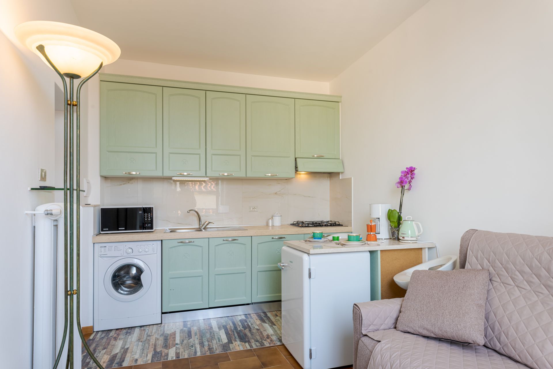 - entrando,, dopo l'ingresso a comune con l'altro appartamento, si trova la zona giorno con piccola cucina super attrezzata ( lavapiatti, due fuochi ad induzione, forno elettrico, forno microonde, frigorifero, cappa super aspirante, piatti stoviglie, caffettiera all'americana, Moka, bollitore, tostapane e tutto ciò che serve per una comoda permanenza per due persone), oltre ad un divano accogliente ed alla televisione collegata alla wifi.