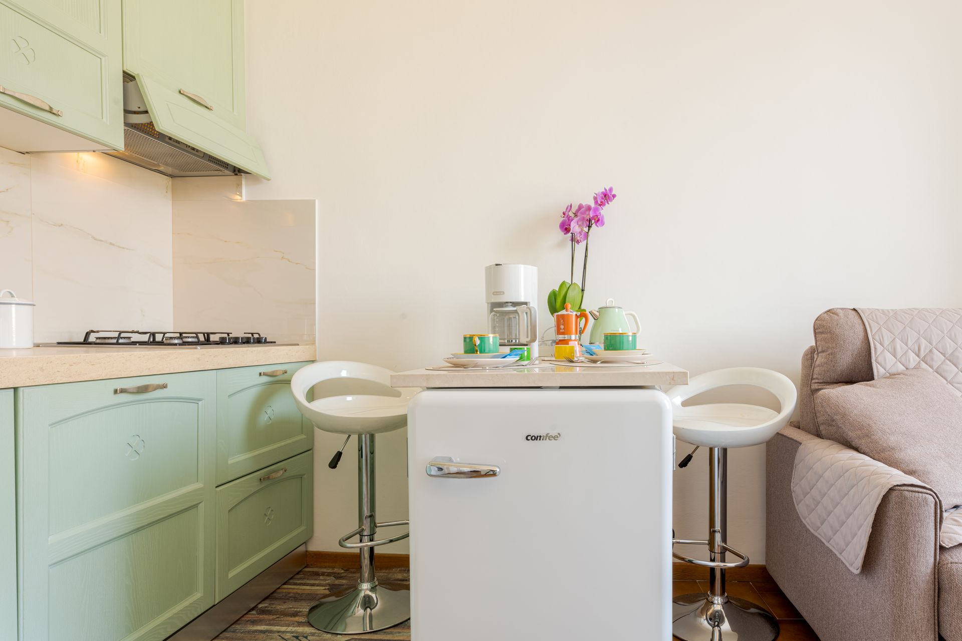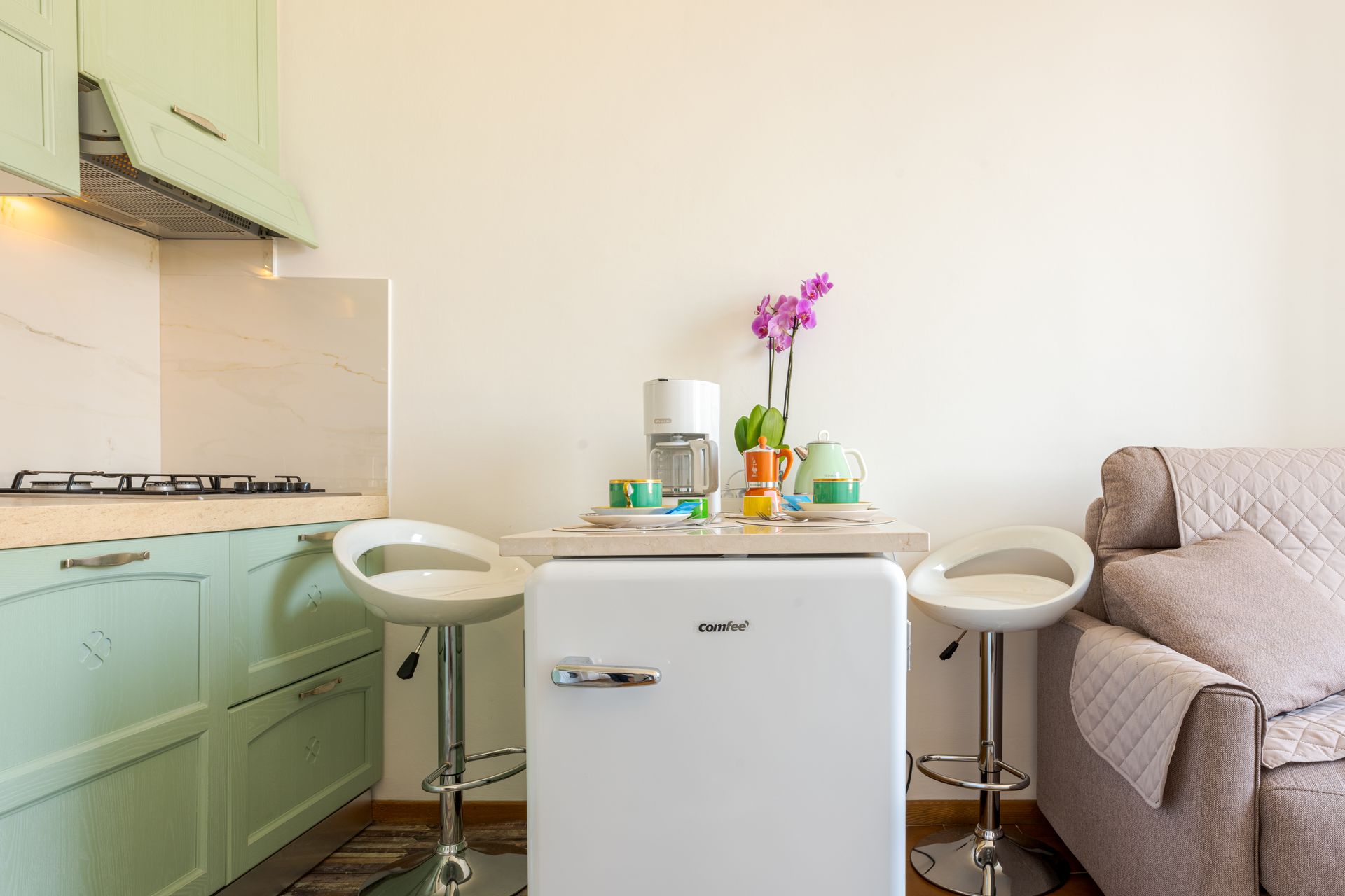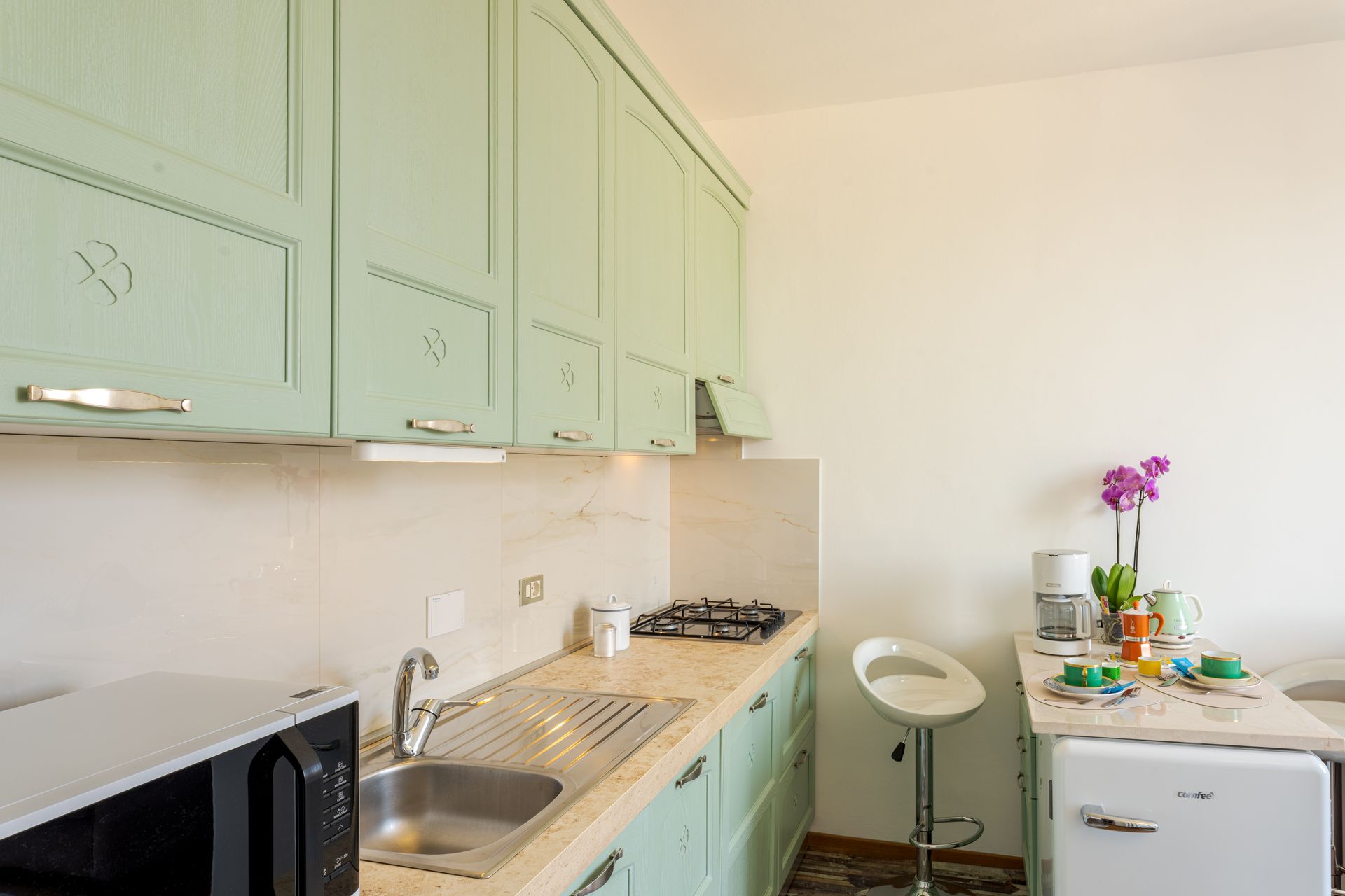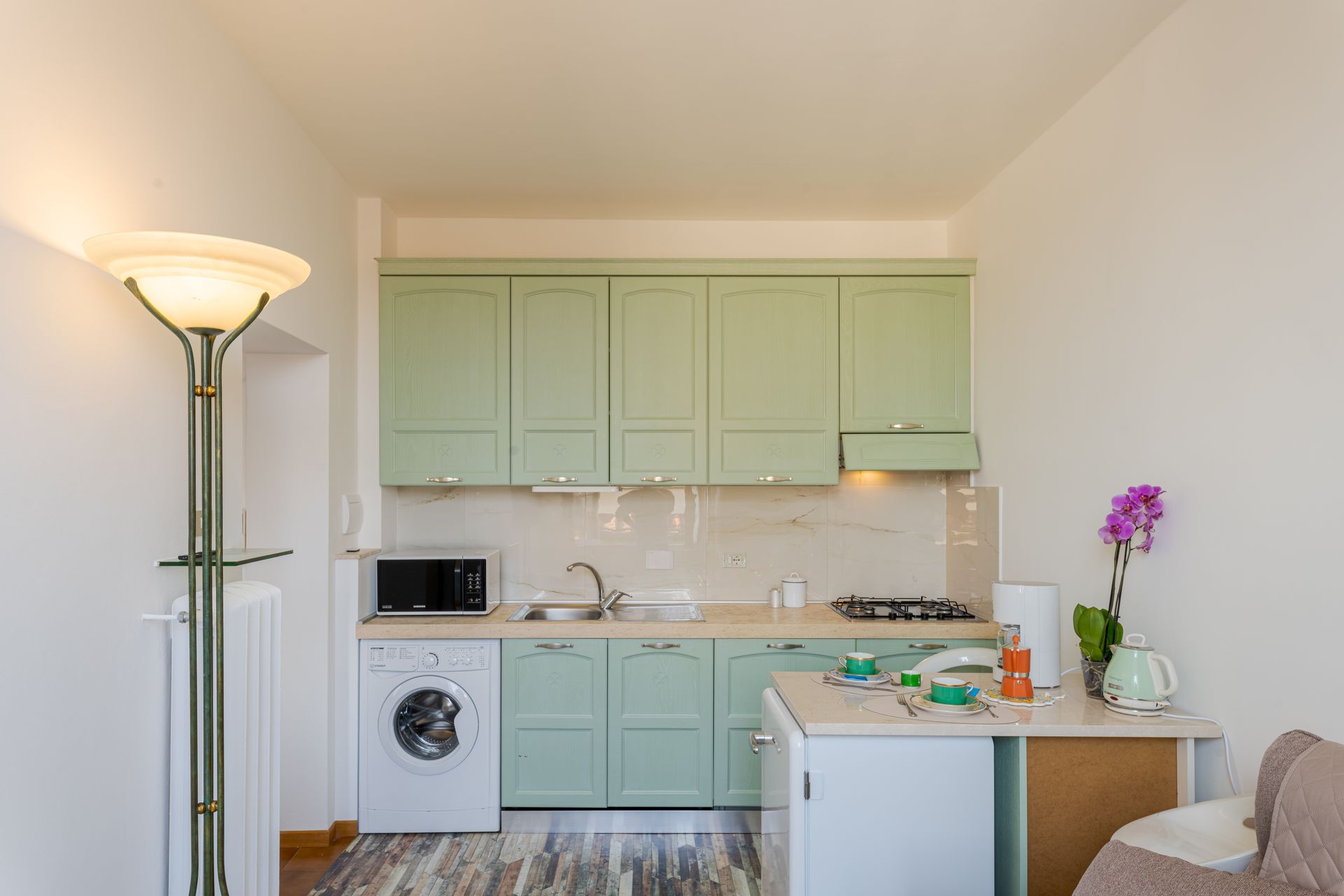 - entrando,, dopo l'ingresso a comune con l'altro appartamento, si trova la zona giorno con piccola cucina super attrezzata ( lavapiatti, due fuochi ad induzione, forno elettrico, forno microonde, frigorifero, cappa super aspirante, piatti stoviglie, caffettiera all'americana, Moka, bollitore, tostapane e tutto ciò che serve per una comoda permanenza per due persone), oltre ad un divano accogliente ed alla televisione collegata alla wifi.