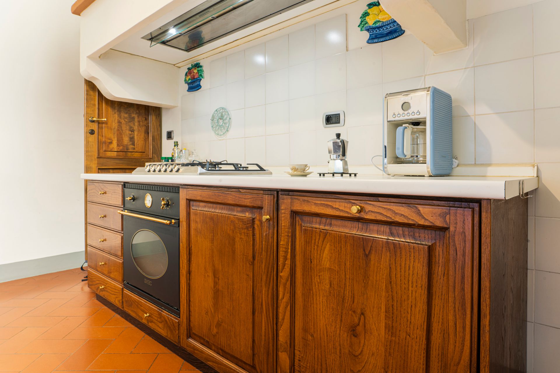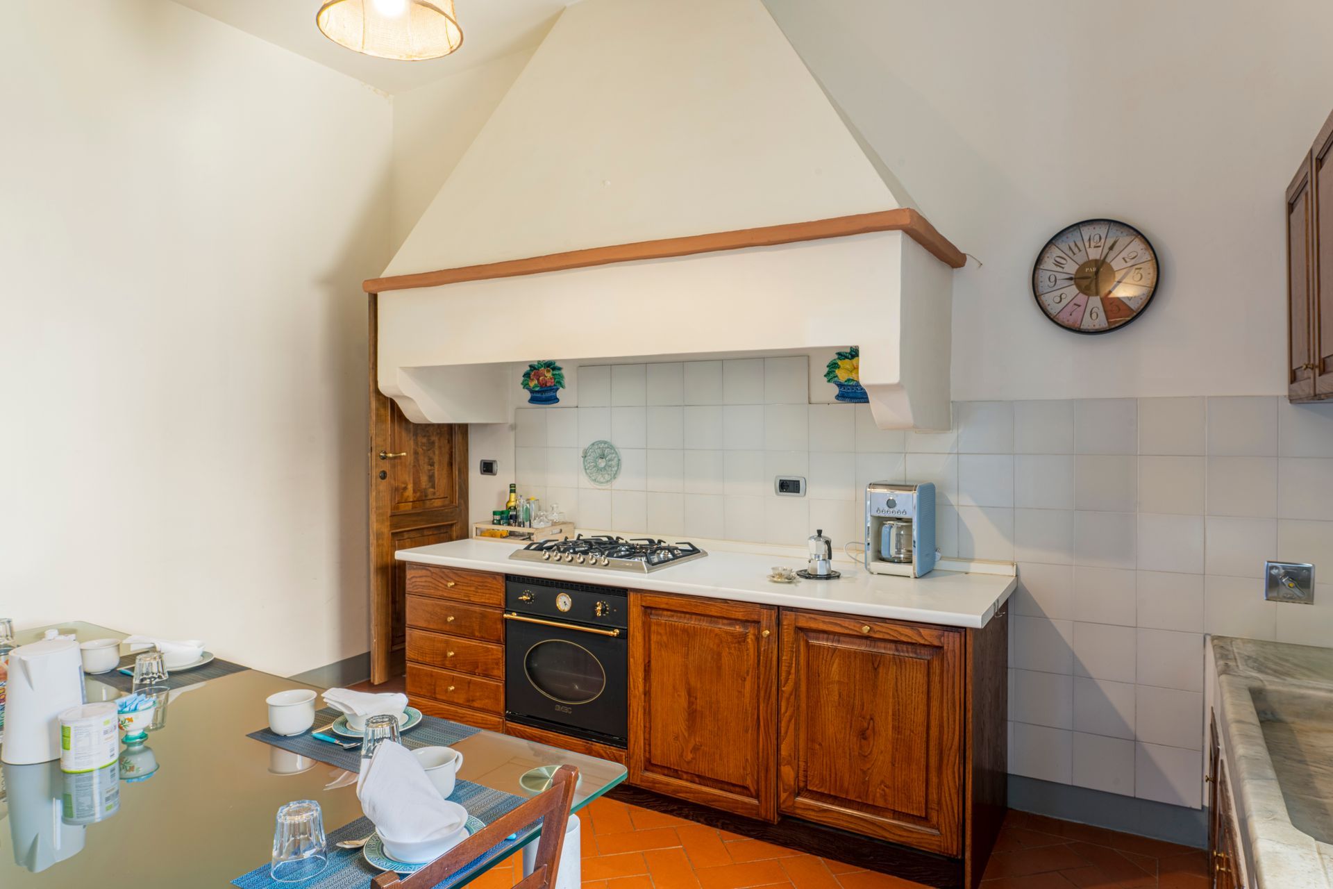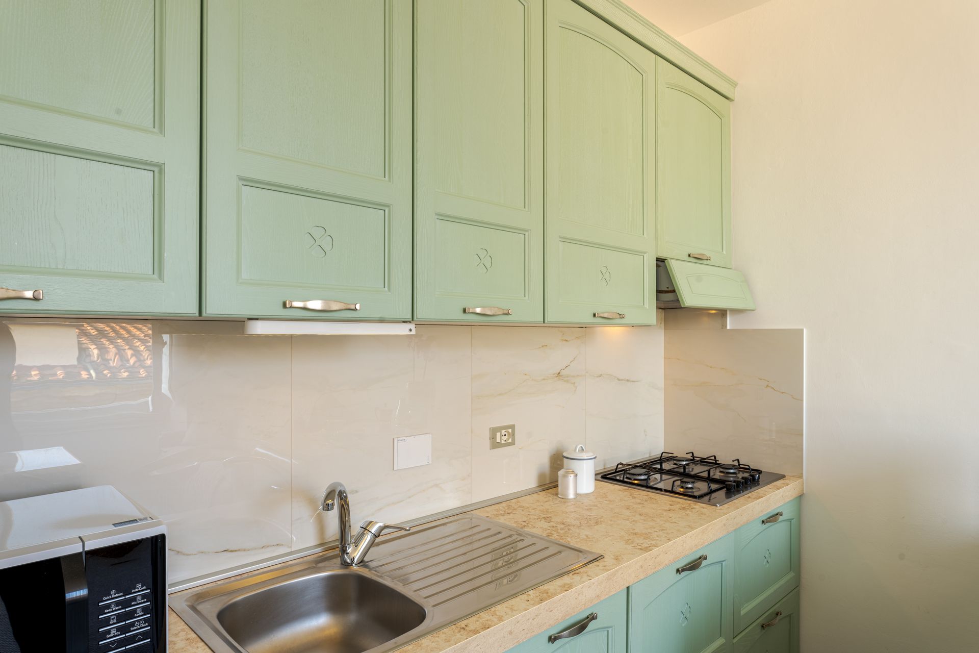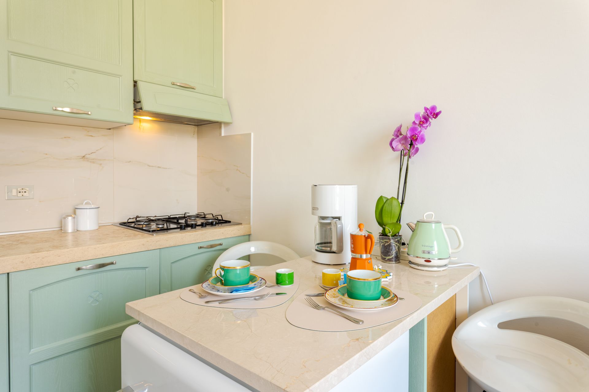 - entrando,, dopo l'ingresso a comune con l'altro appartamento, si trova la zona giorno con piccola cucina super attrezzata ( lavapiatti, due fuochi ad induzione, forno elettrico, forno microonde, frigorifero, cappa super aspirante, piatti stoviglie, caffettiera all'americana, Moka, bollitore, tostapane e tutto ciò che serve per una comoda permanenza per due persone), oltre ad un divano accogliente ed alla televisione collegata alla wifi.