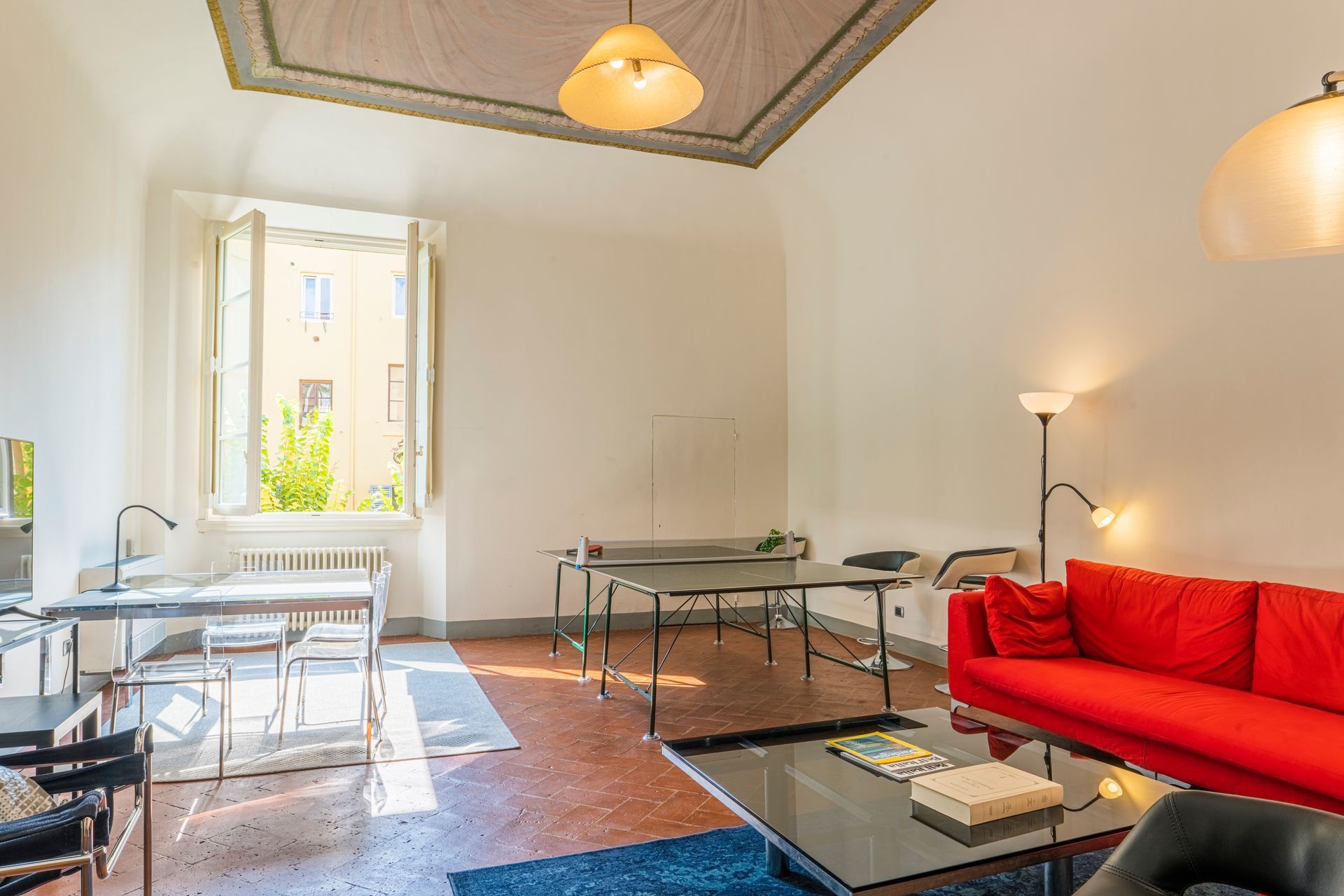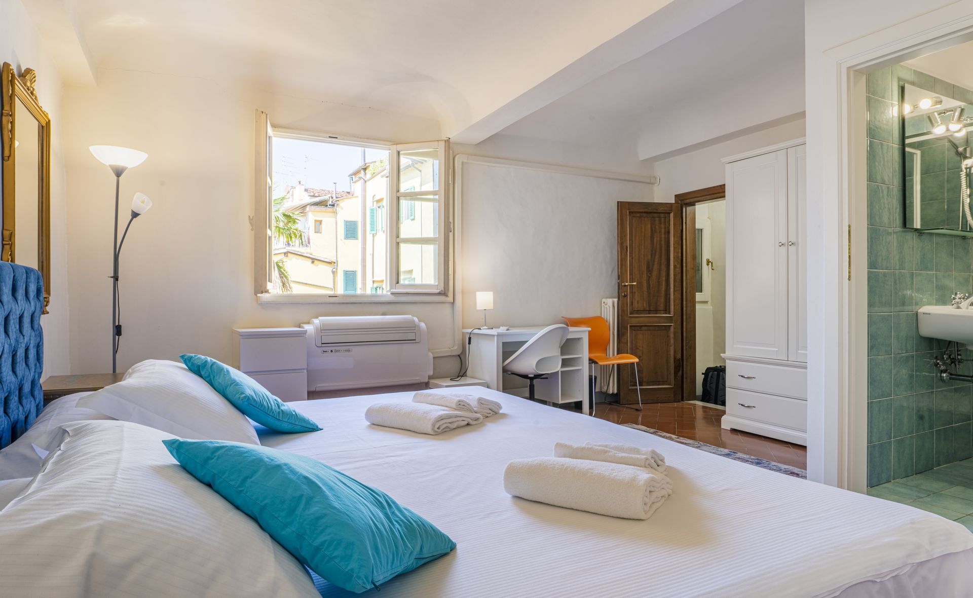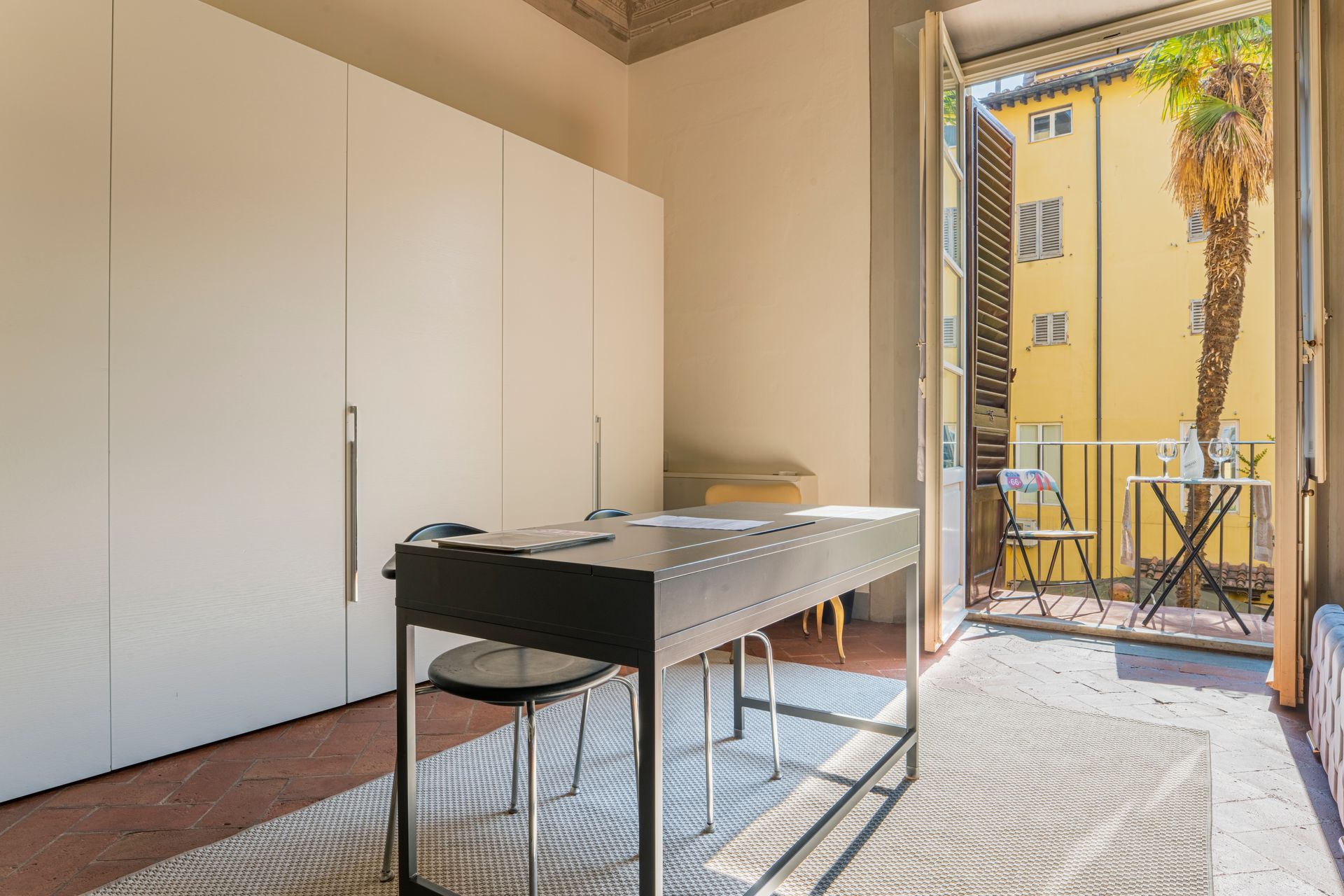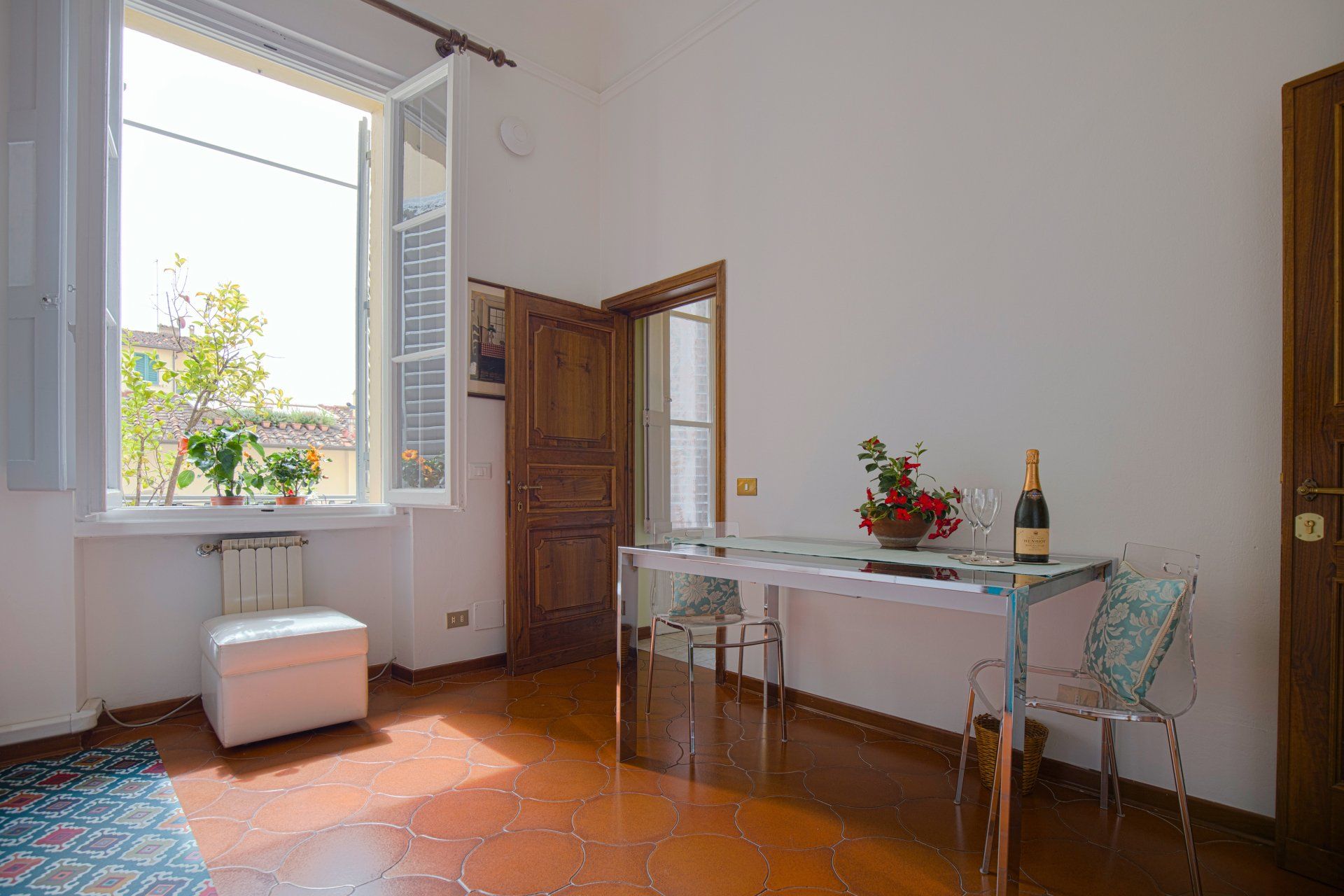 L’appartamento si trova nella porzione interna di Palazzo Pepi e non ha alcuna finestra vie esterne, ha una splendida vista sul giardino interno del Palazzo e gli infissi antirumore assicurano la massima silenziosità.