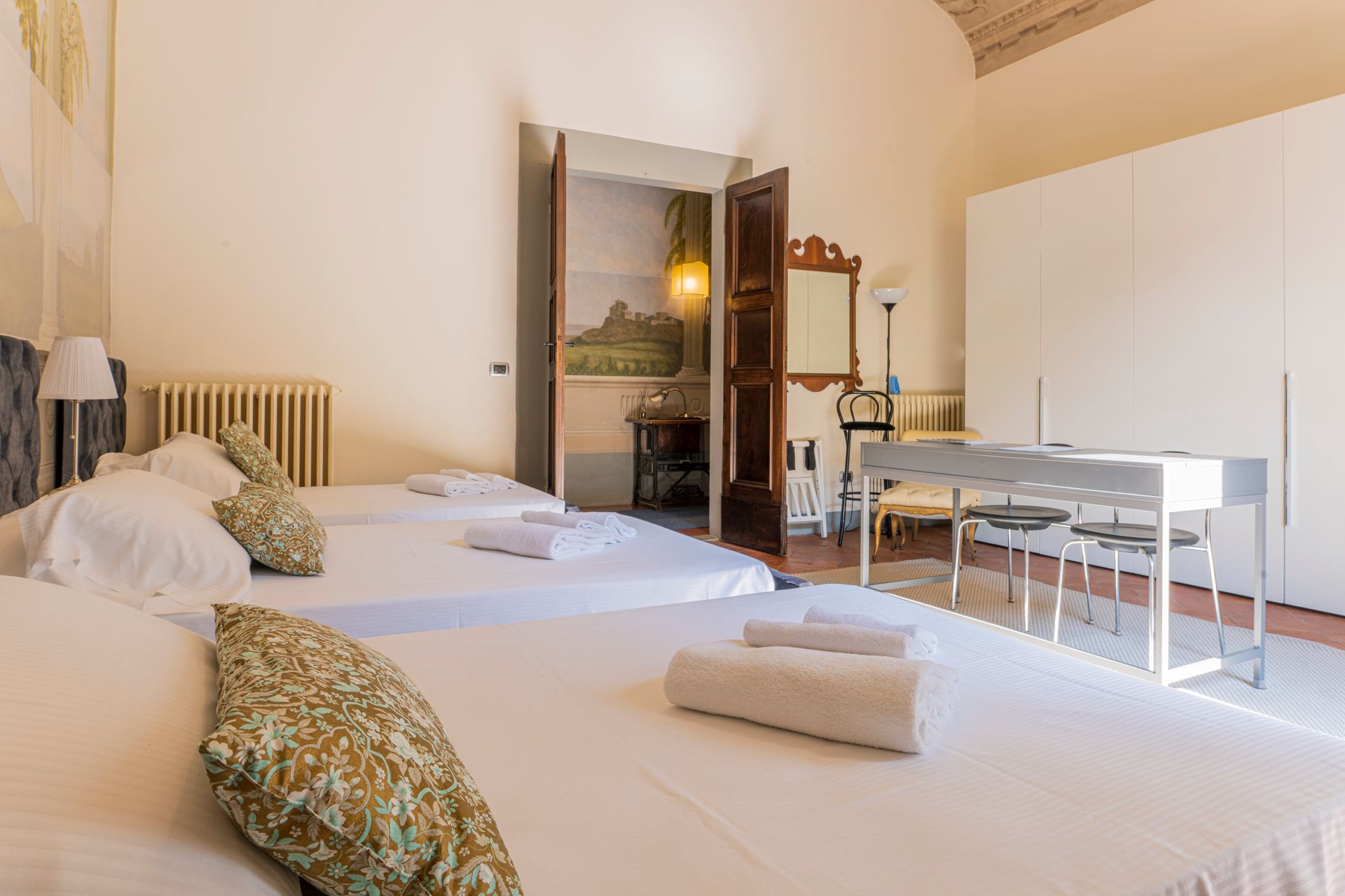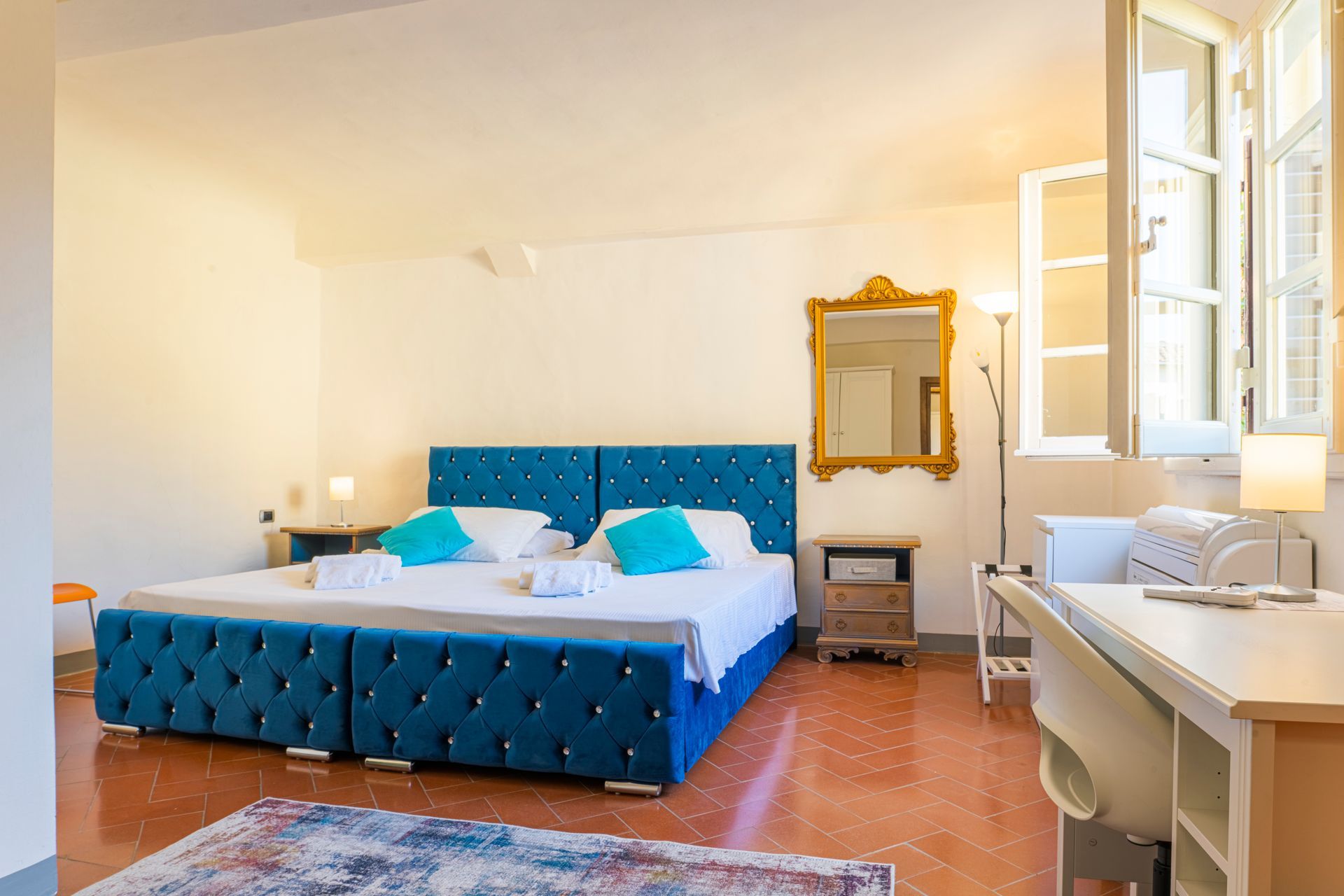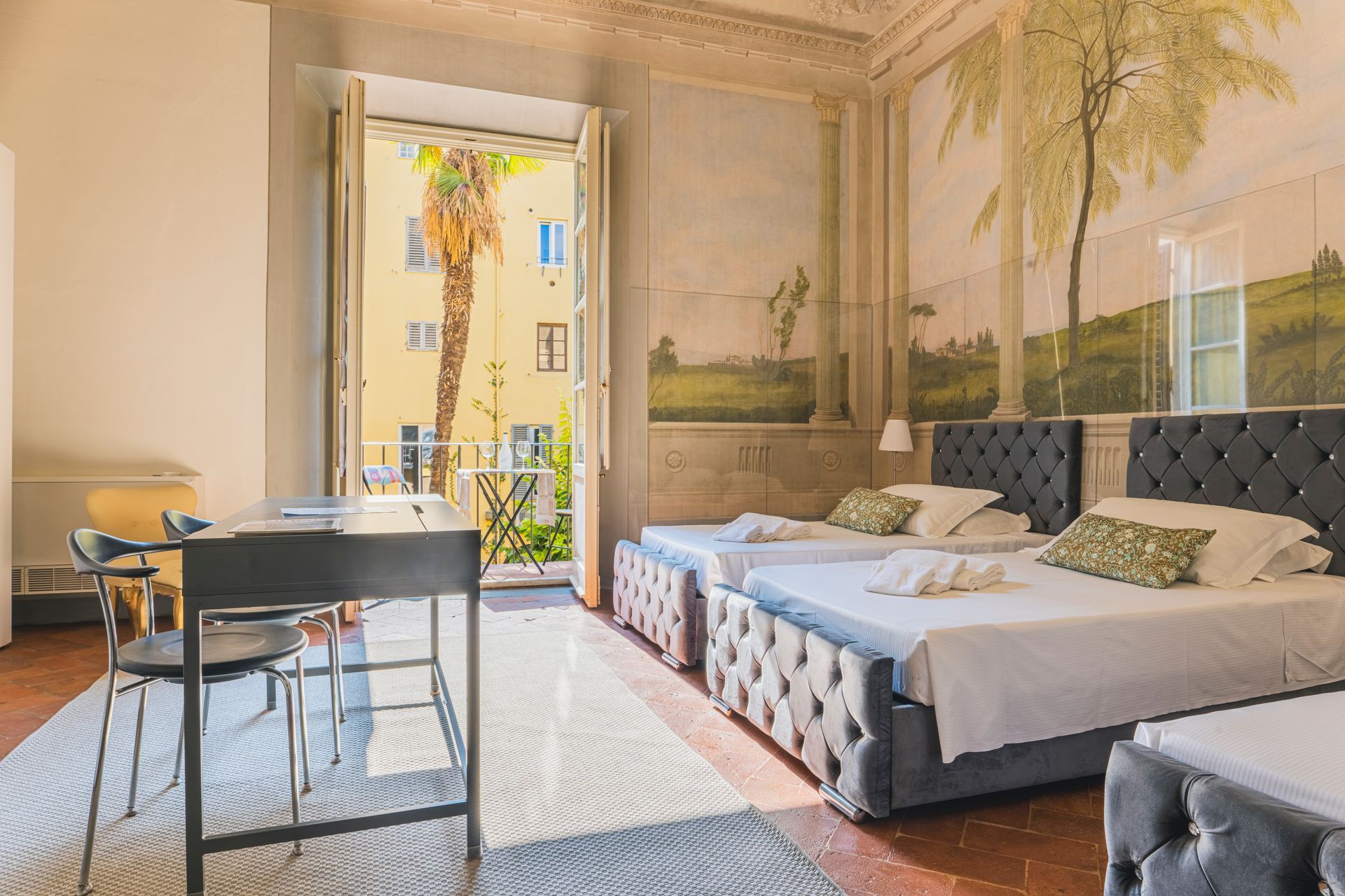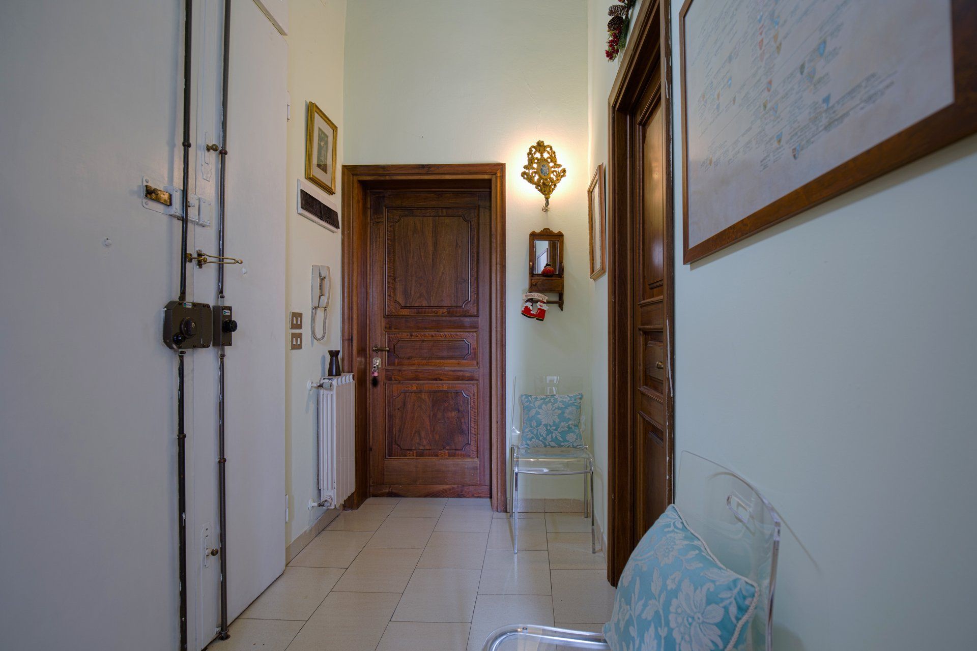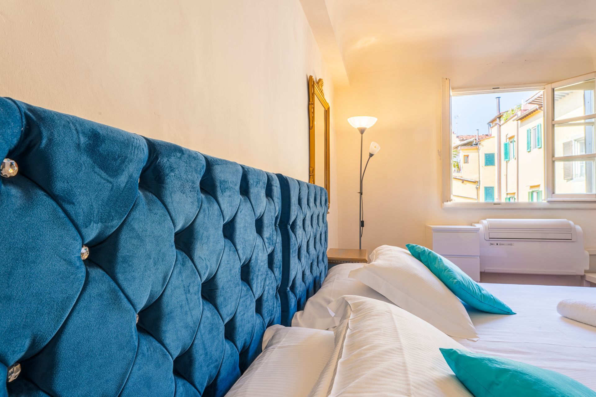 L’appartamento si trova nella porzione interna di Palazzo Pepi e non ha alcuna finestra vie esterne, ha una splendida vista sul giardino interno del Palazzo e gli infissi antirumore assicurano la massima silenziosità.