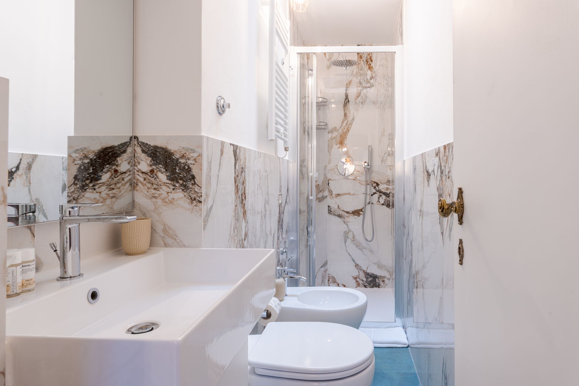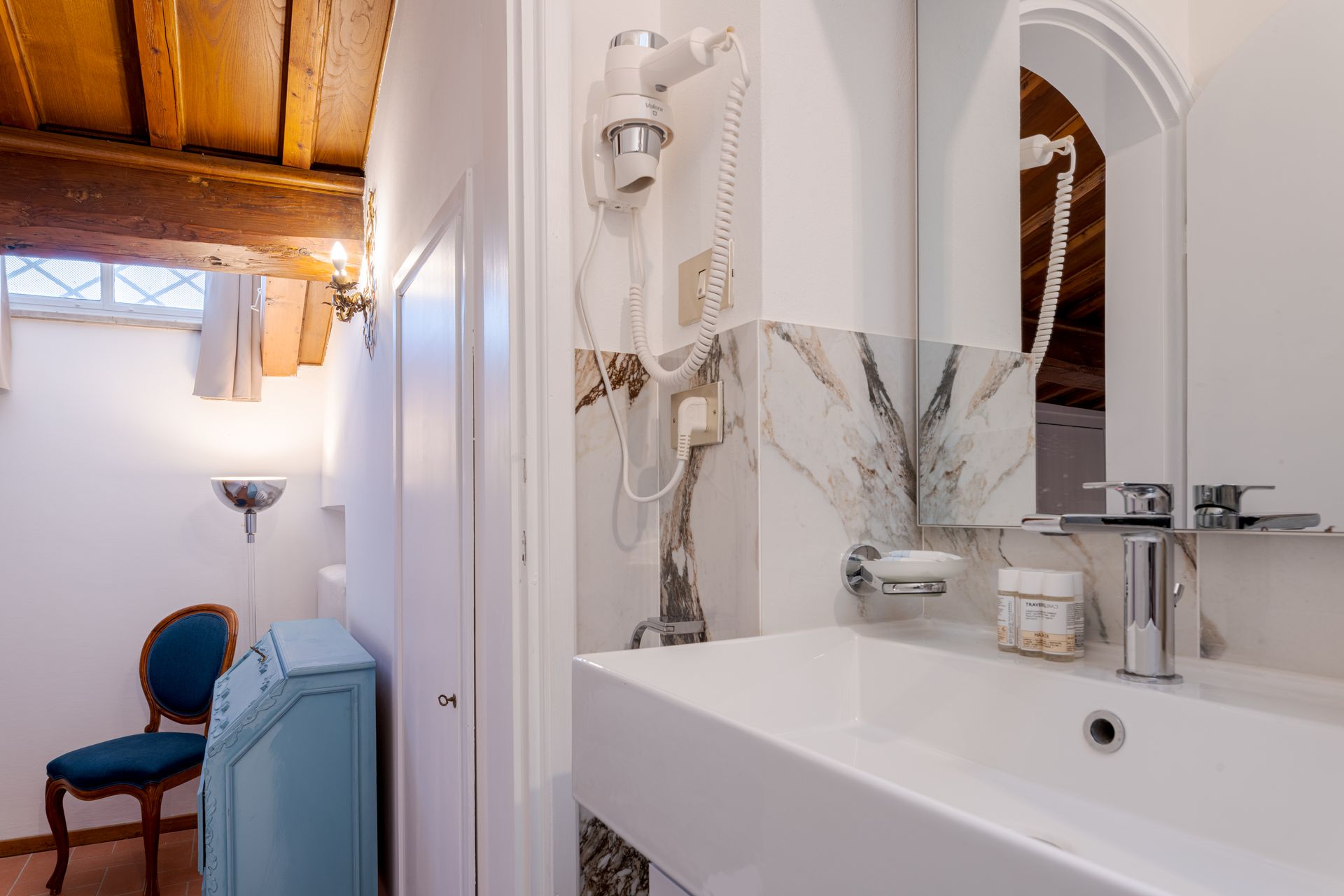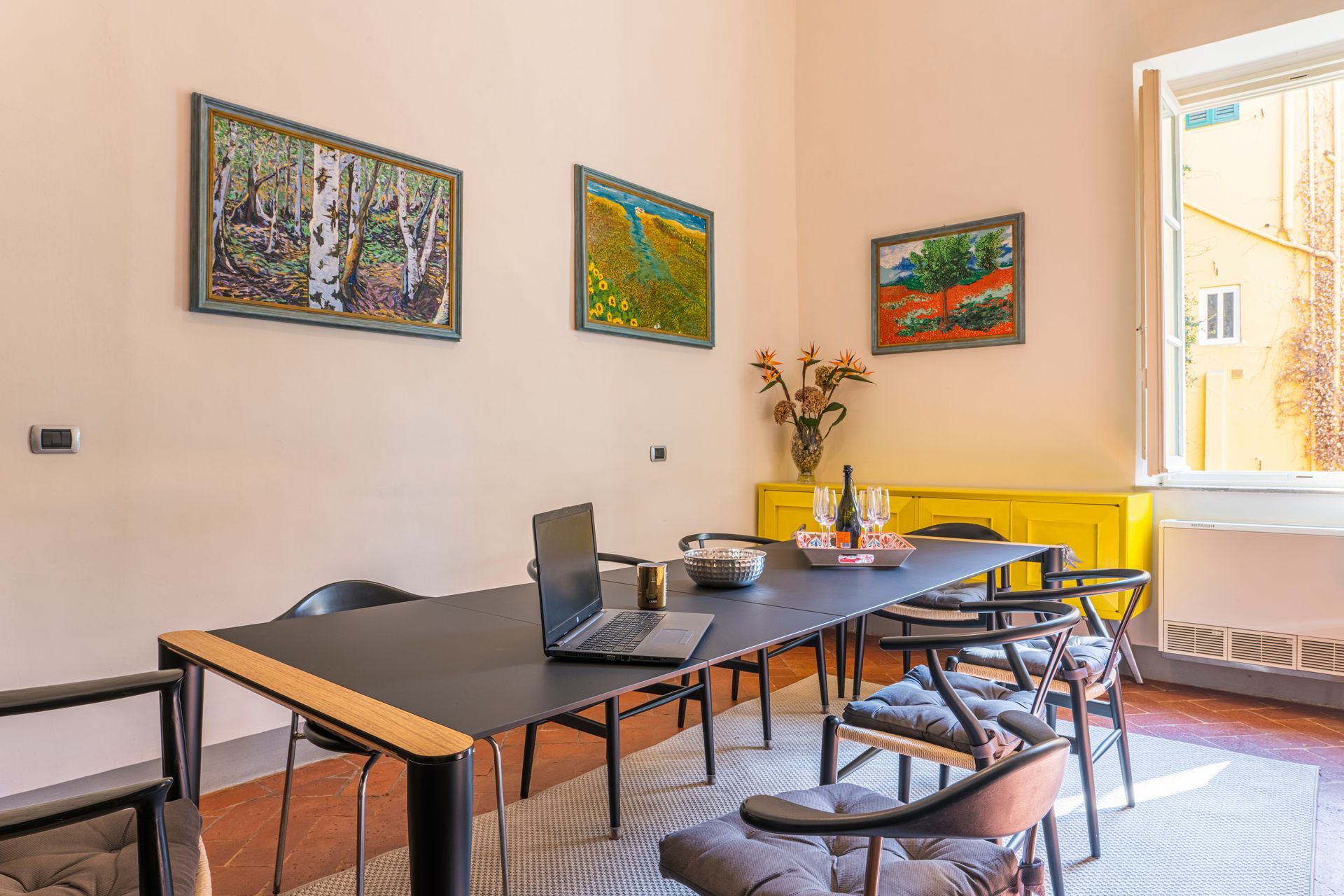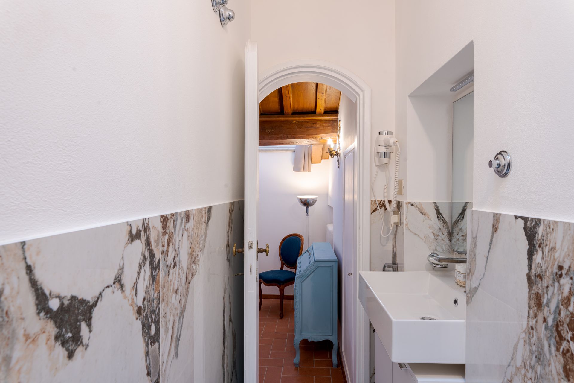 L’appartamento si trova nella porzione interna di Palazzo Pepi e non ha alcuna finestra vie esterne, ha una splendida vista sul giardino interno del Palazzo e gli infissi antirumore assicurano la massima silenziosità.