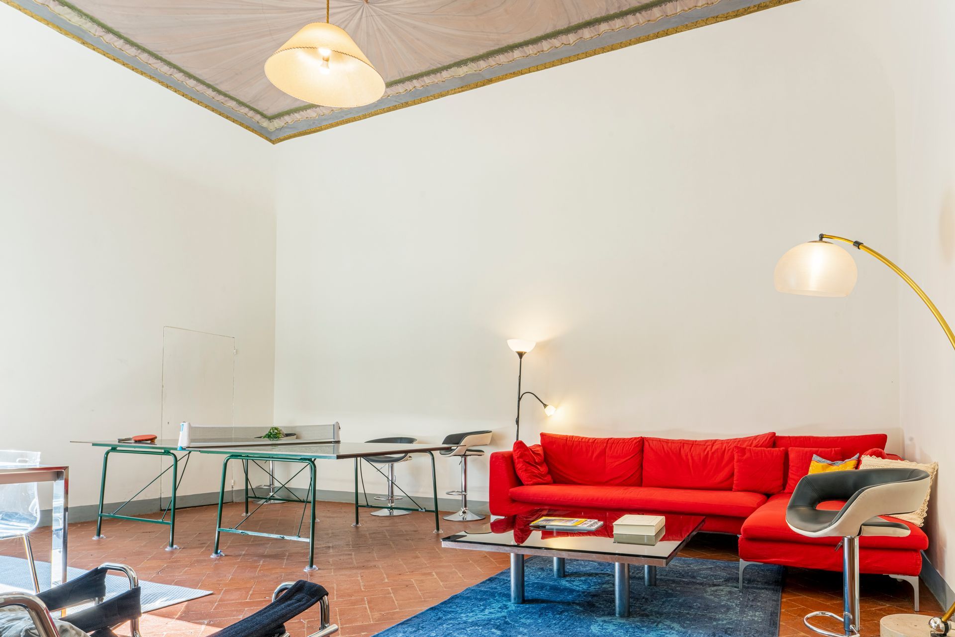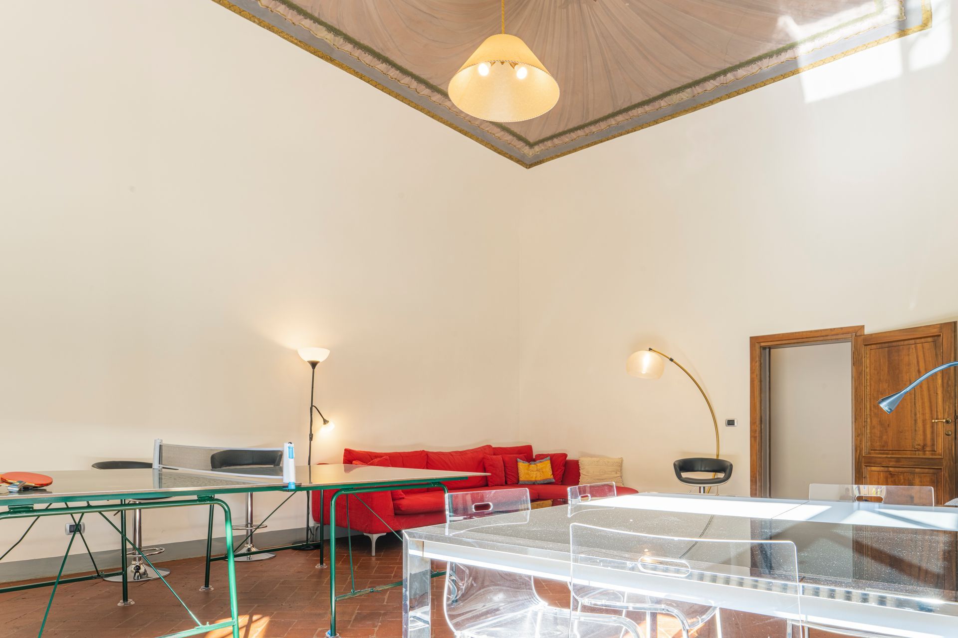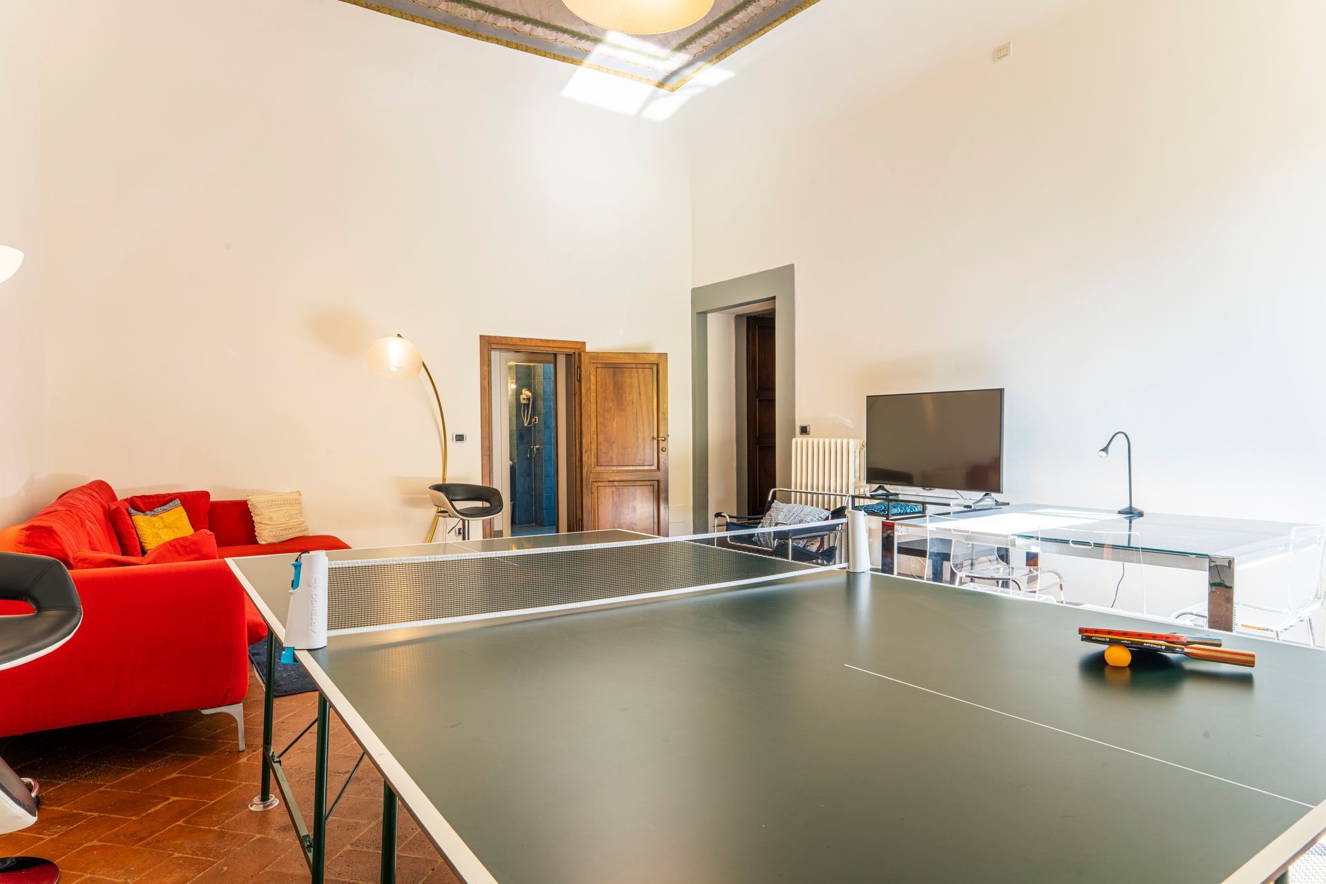 Al piano primo ci sono un’ampia cucina, una sala da pranzo con tavolo per 12 persone, una sala da giorno attrezzata con televisione e divani, un tavolo da lavoro ed uno da ping-pong, due bagni e due camere da letto, delle quali una con un balcone che dà sul giardino.