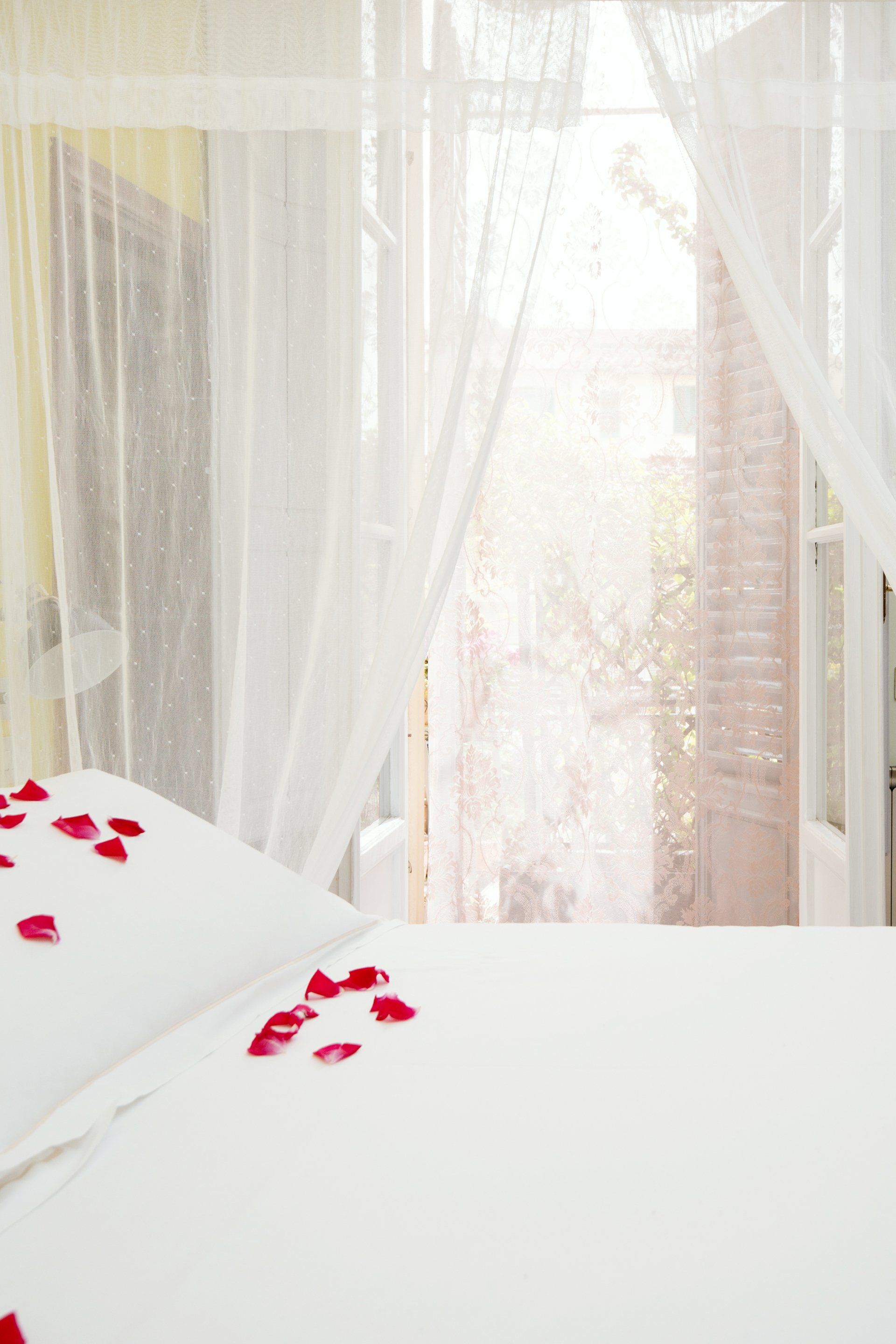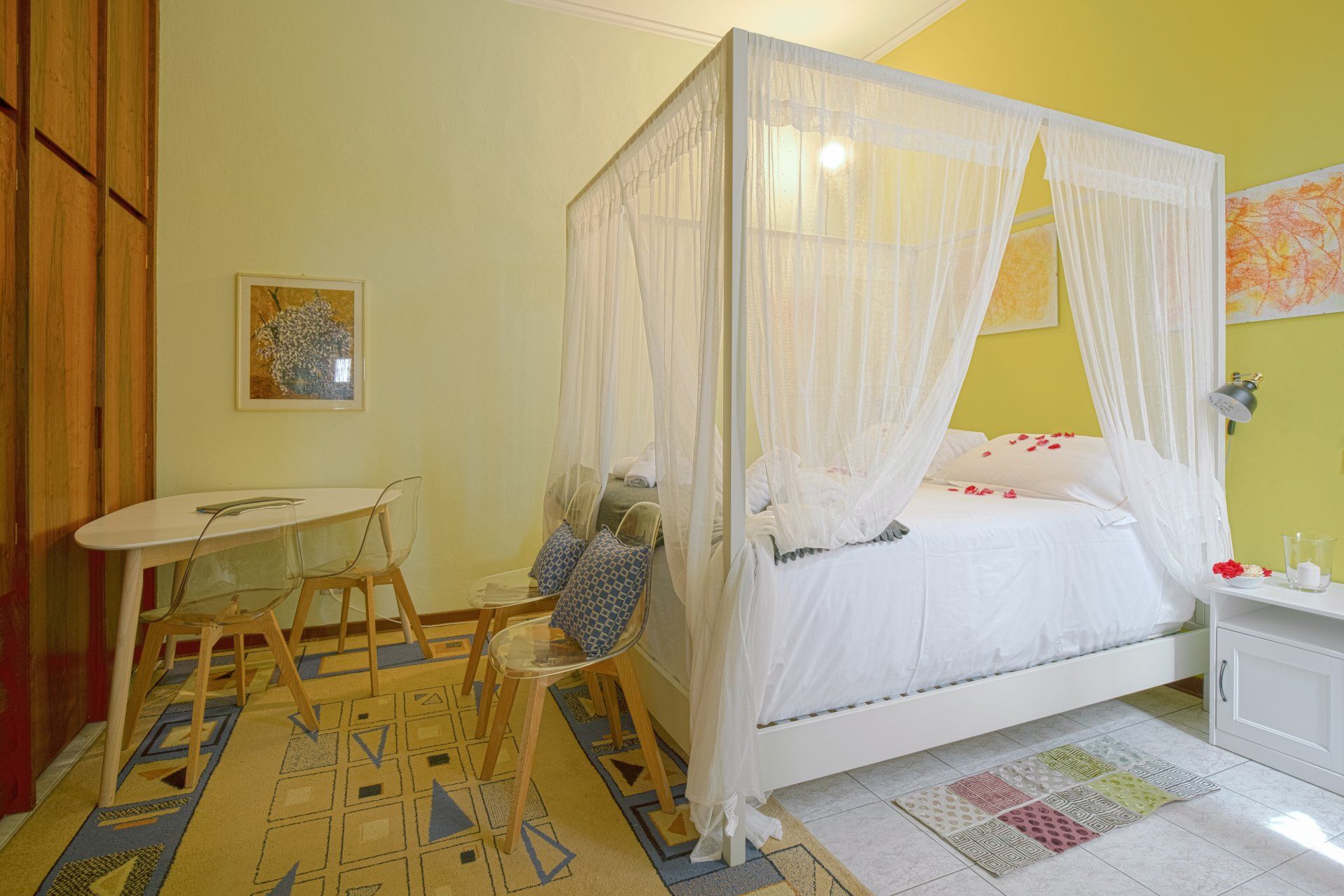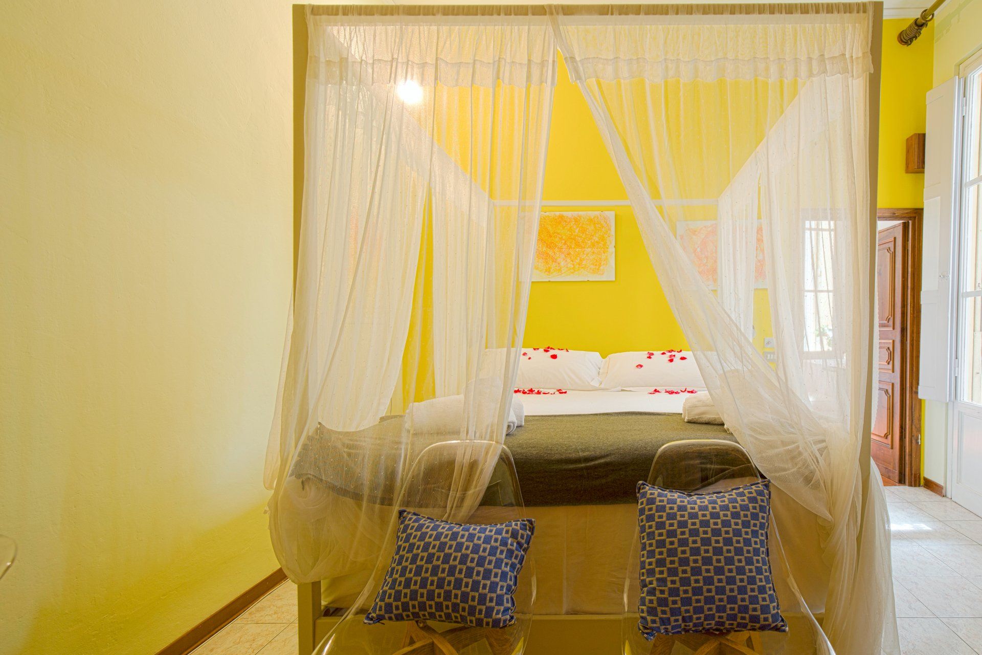 Da qui si accede all'ampia camera da letto (25 mq) con moderno letto a baldacchino, materasso a molle alto 30cm e 180 X200 ed armadio in noce moderno a 8 ante, una grande parete attrezzata per riporre tutti i vostri bagagli. La camera dà accesso ad un romantico balcone fiorito all'interno del quartiere: luminosissimo e silenzioso dove poter mangiare a lume di candela.